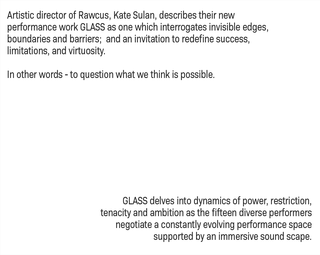 When invited this company to nominate an ‘Impossible Task’, Rawcus responded by seeking a way of improvising in very different physical locations while attempting to find the same energetic connection and quality they experience in the rehearsal room.